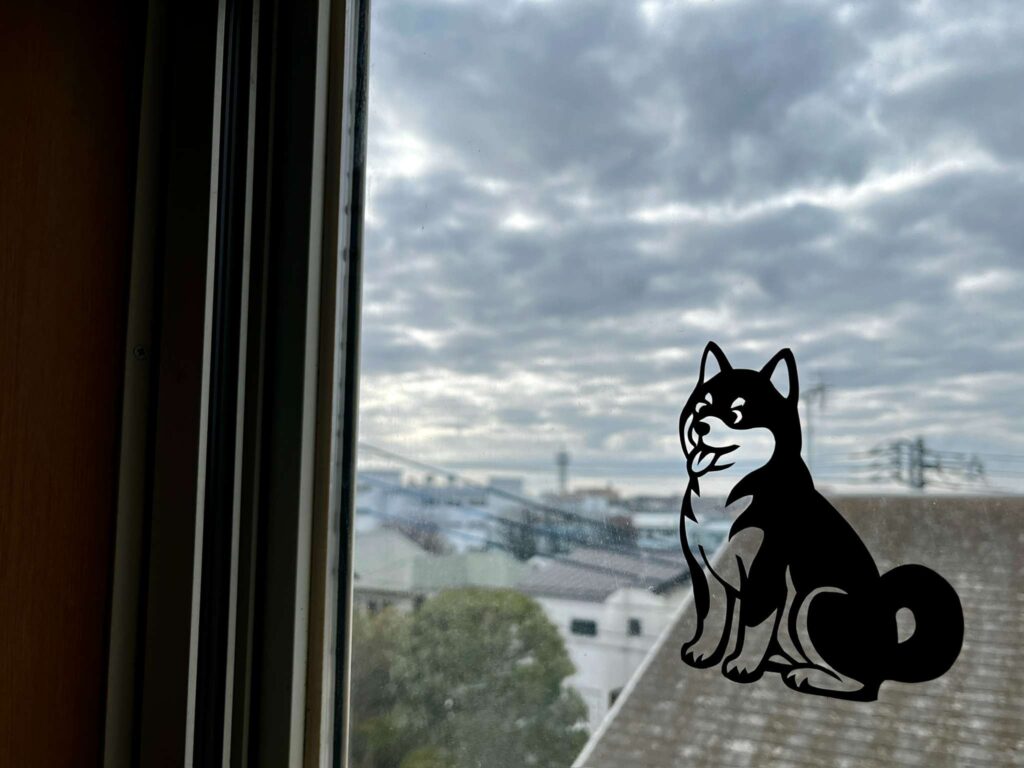 昼間は外の青空や雲を背景に犬のシルエットがくっきりと浮かび上がり、夕暮れ時にはオレンジ色の光に包まれます。