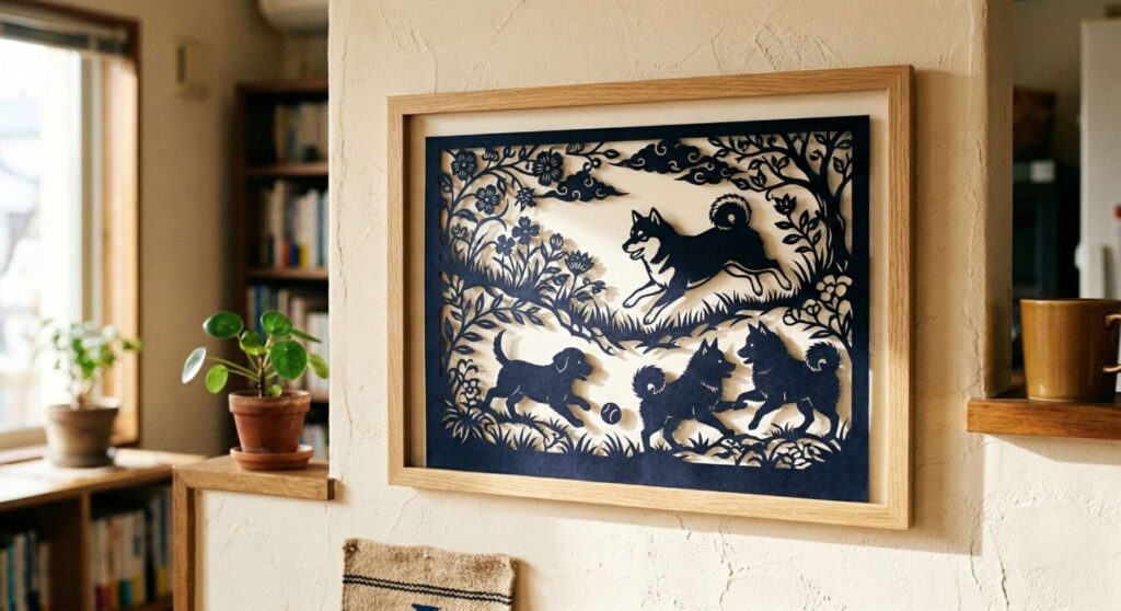特に犬をモチーフにした切り絵は、シルエットだけでもその愛らしさや躍動感が伝わり、空間に飾るだけでホッと安らぐような温かみをもたらしてくれます。