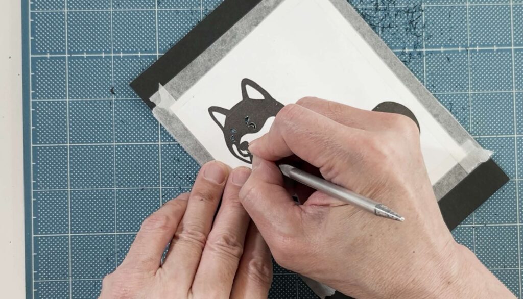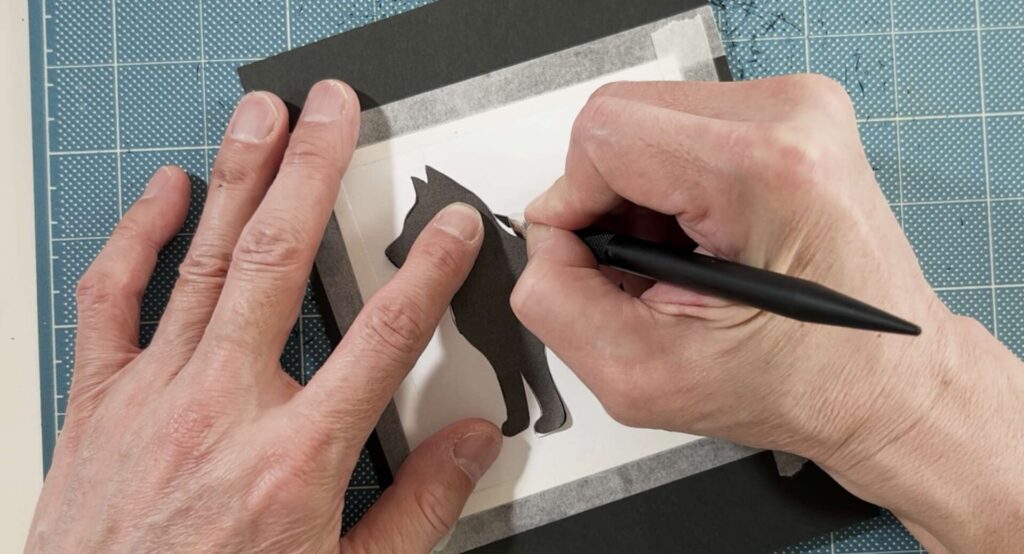 切り絵は必ず「内側の細かい部分(目や模様など)」から切り始め、徐々に「外側の大きな部分」へと向かって切っていきます。