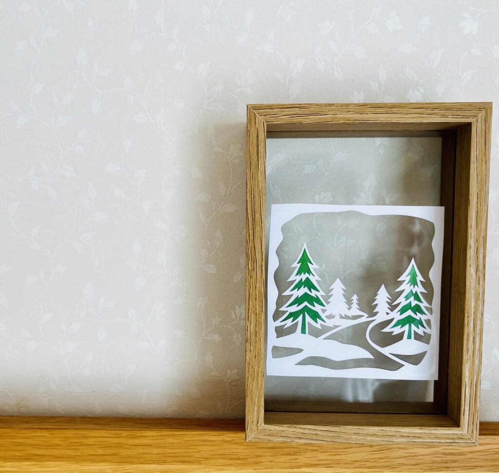 白い紙でつくったモミの木の切り絵は両面透明フレームにいれて飾っても素敵です。