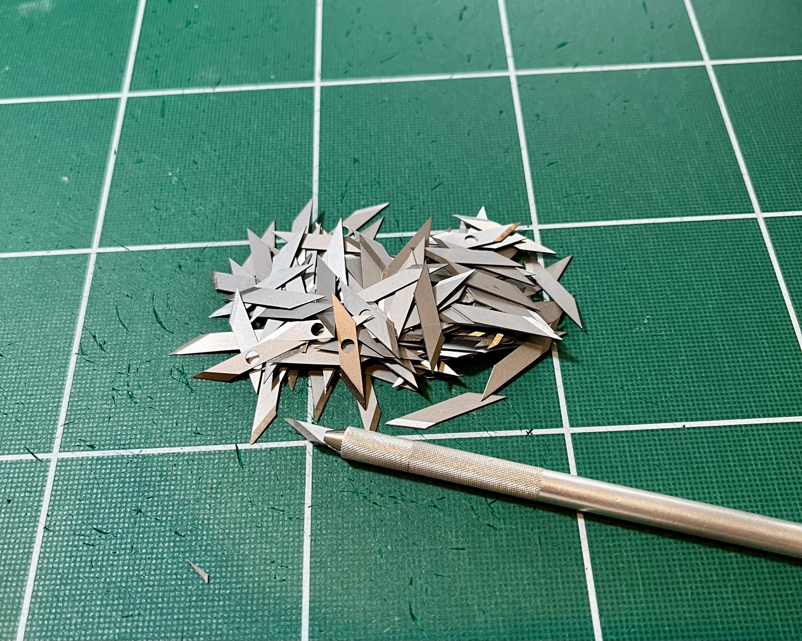 一般的に「子供の工作」ではハサミを使いますが、大人の趣味として楽しむなら断然「デザインナイフ(ペン型のカッター)」がおすすめです。