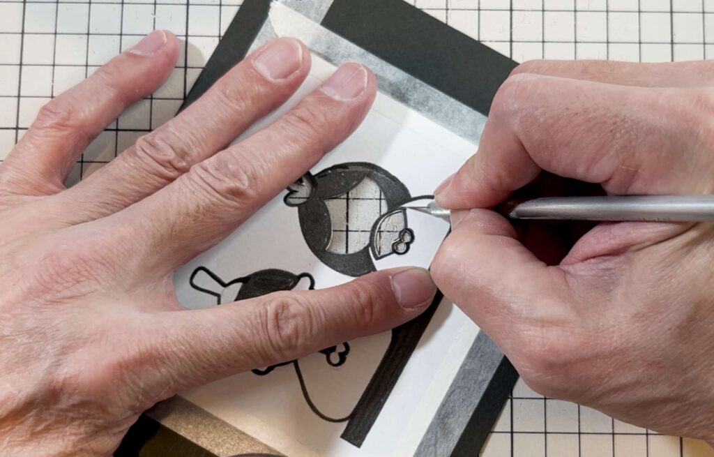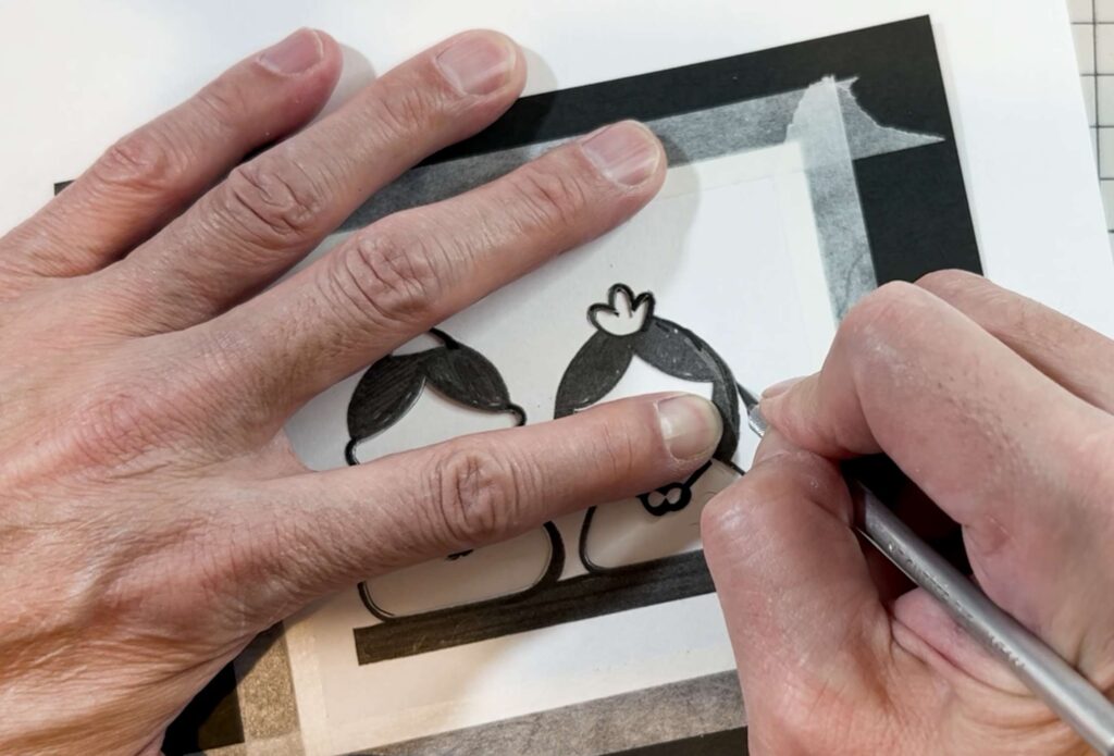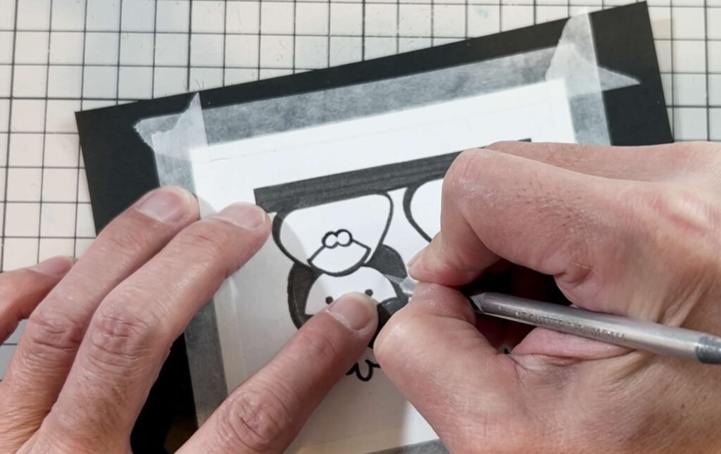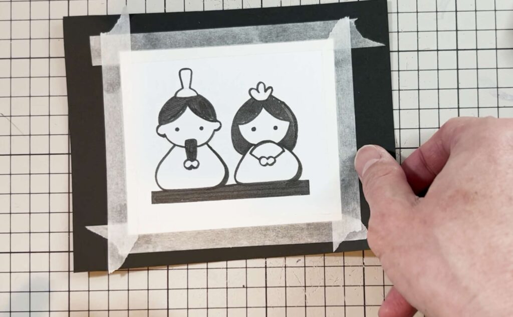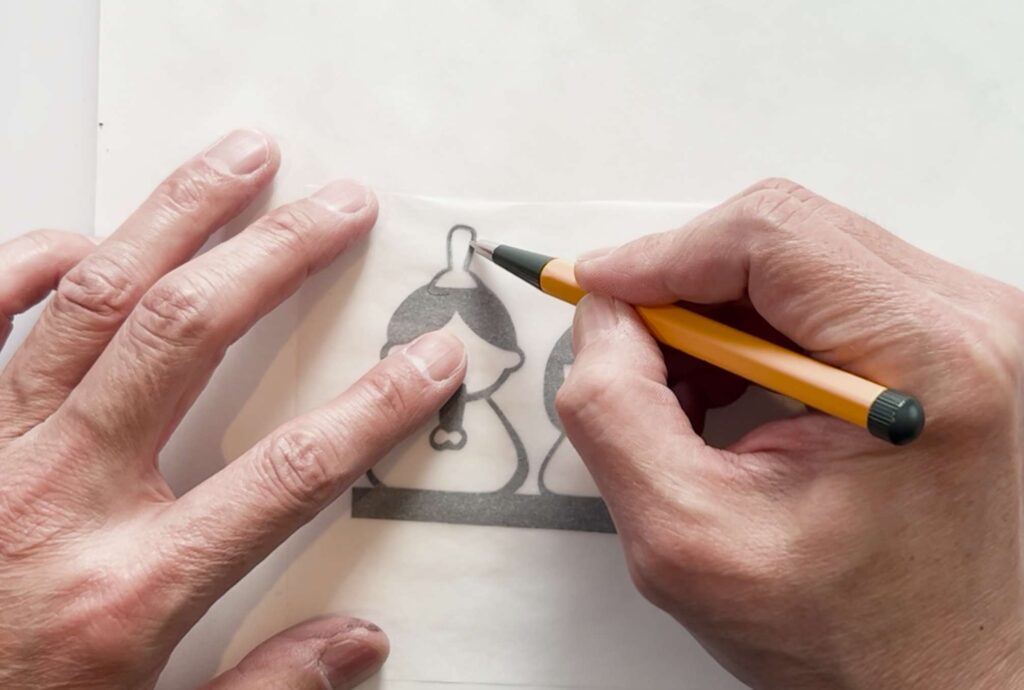 切り抜いた黒い切り絵(または元の図案)の上にトレーシングペーパーを重ね、色のつけたい部分のアタリ線(輪郭)を鉛筆でなぞります。