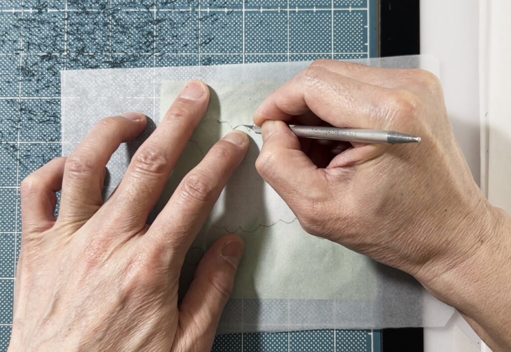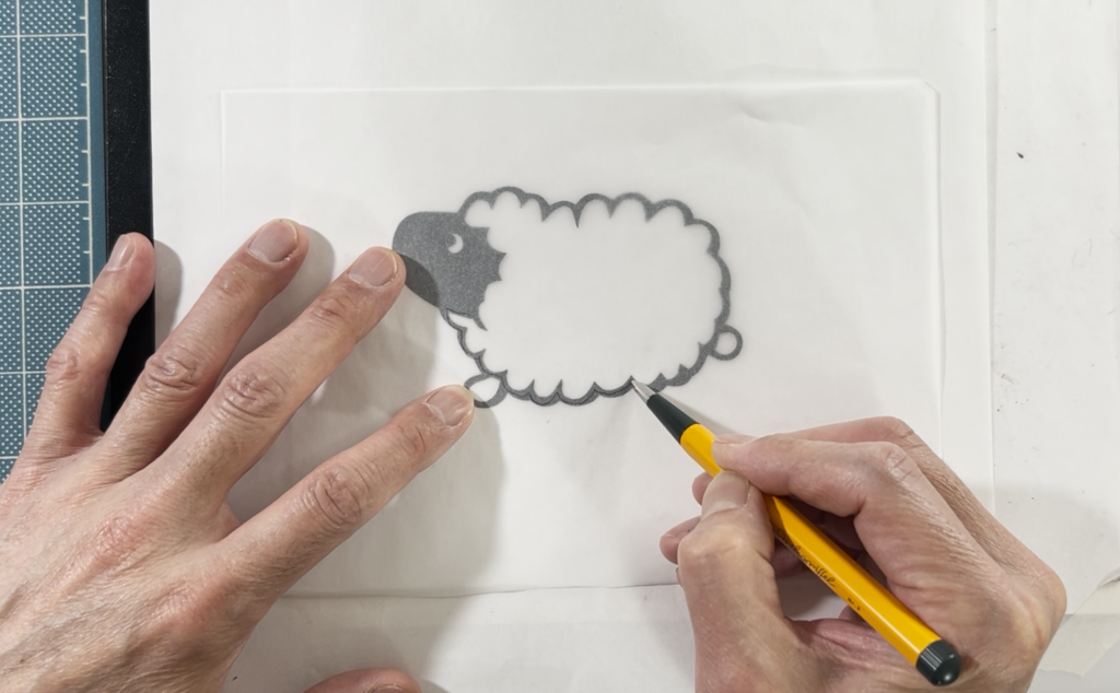 切り抜いた図案の上にトレーシングペーパーを重ね、色を付けたい部分の形に合わせて鉛筆などで「アタリ線(輪郭線)」を描き写します。