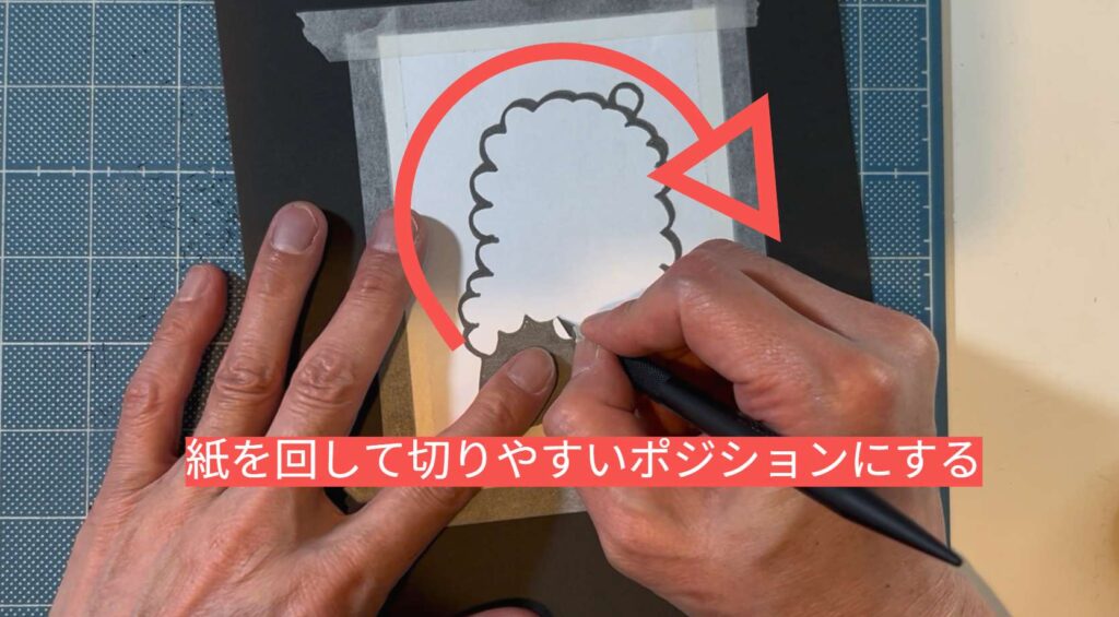 刃先は常に自分の手前に向かって真っ直ぐ引き、曲線に合わせて「紙のほうを回す」のが美しい曲線を切る最大のコツです。
