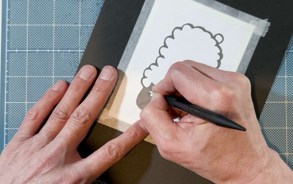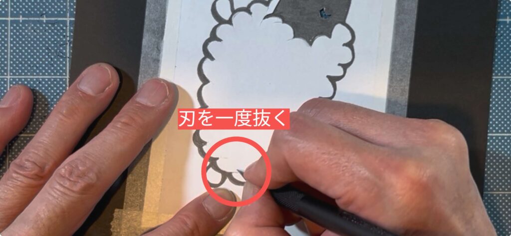 羊の丸みを帯びた輪郭を切る際、手首をひねってナイフを動かすと線がガタガタになってしまいます。