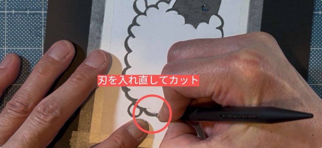 ハサミだと内側を切り抜く際にどうしても紙を折る必要がありますが、ペン型のデザインナイフなら、紙を平らなままスッと刃を入れることができるので、「切りたくない場所を傷つけない」という安心感があります。