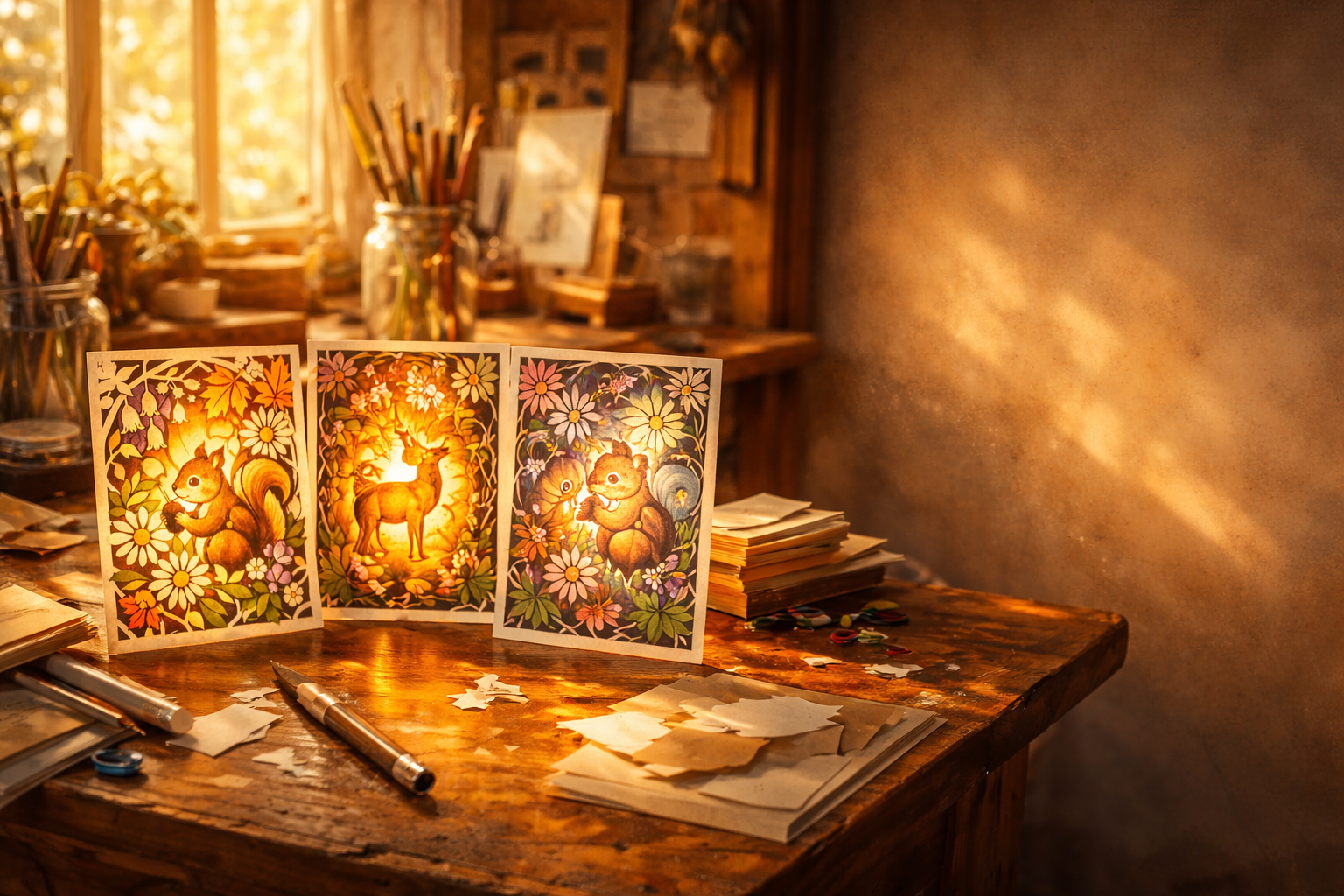 あなたは、絵を描く必要はありません。 私が作成した「可愛い動物」や「季節の花」の図案を、カッターでなぞるように切っていくだけ。 そこに色を重ねれば、まるでステンドグラスのように光が透ける、あなただけのファンタジーアートが完成します。