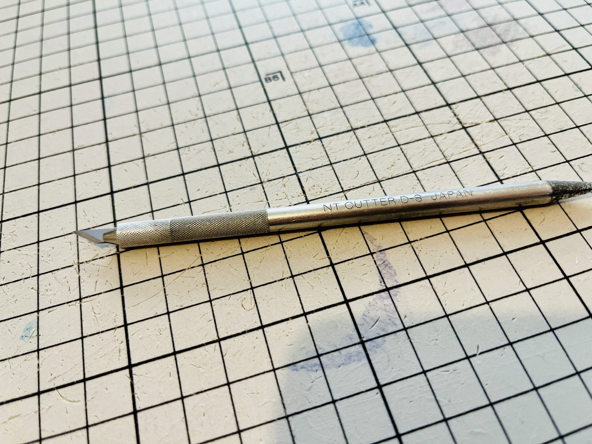 線の交点(角)では、刃をすーっと引くのではなく、最後に垂直に立てて「プスッ」と刺すように終えるときれいな鋭角が出ます。