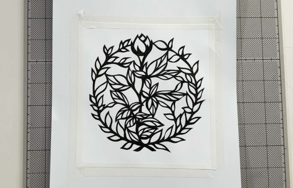 プリントした図案と本番の紙を重ね、四隅をテープでしっかり止めます。
