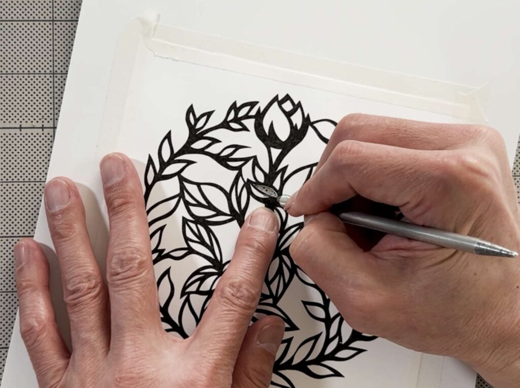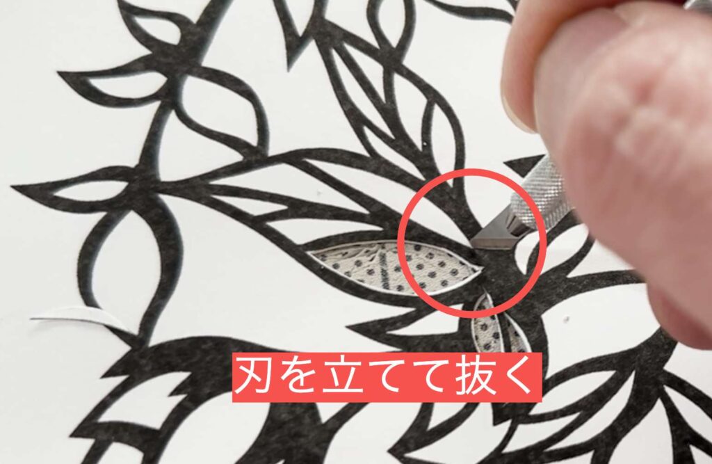 図案の外側の線を舐めるように、デザインナイフをゆっくり走らせるのが綺麗に仕上げるコツです。