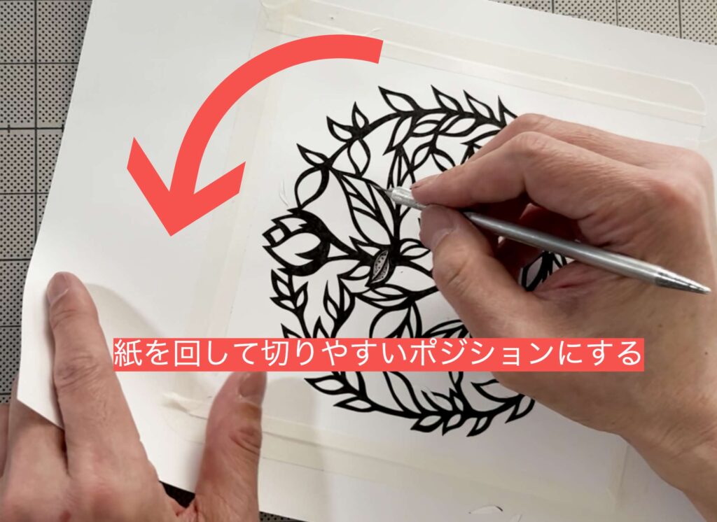 また、手首を無理に曲げるのではなく、常に自分の切りやすいポジションになるよう「紙の方を回しながら」切っていくのも大切なポイントです。