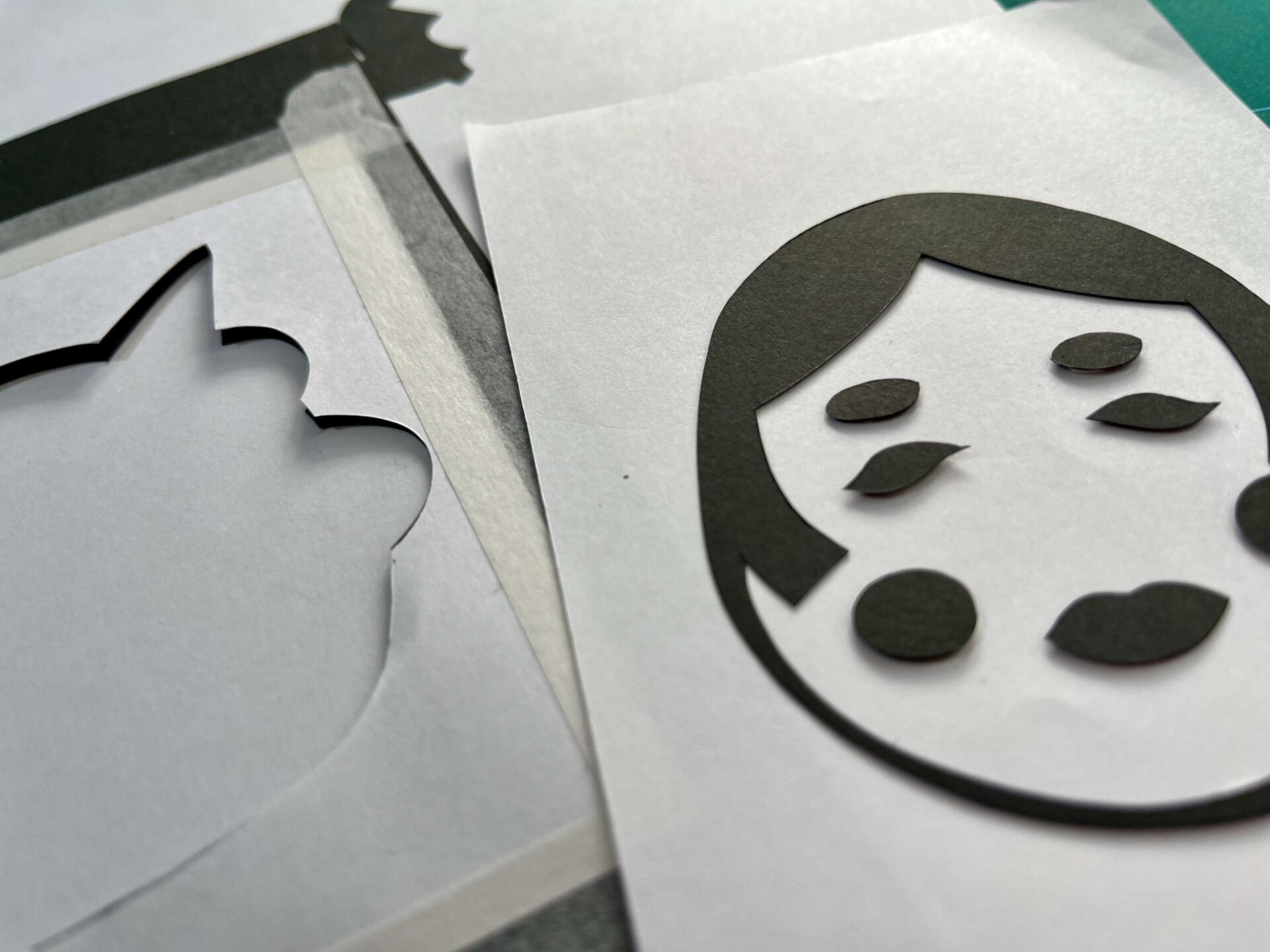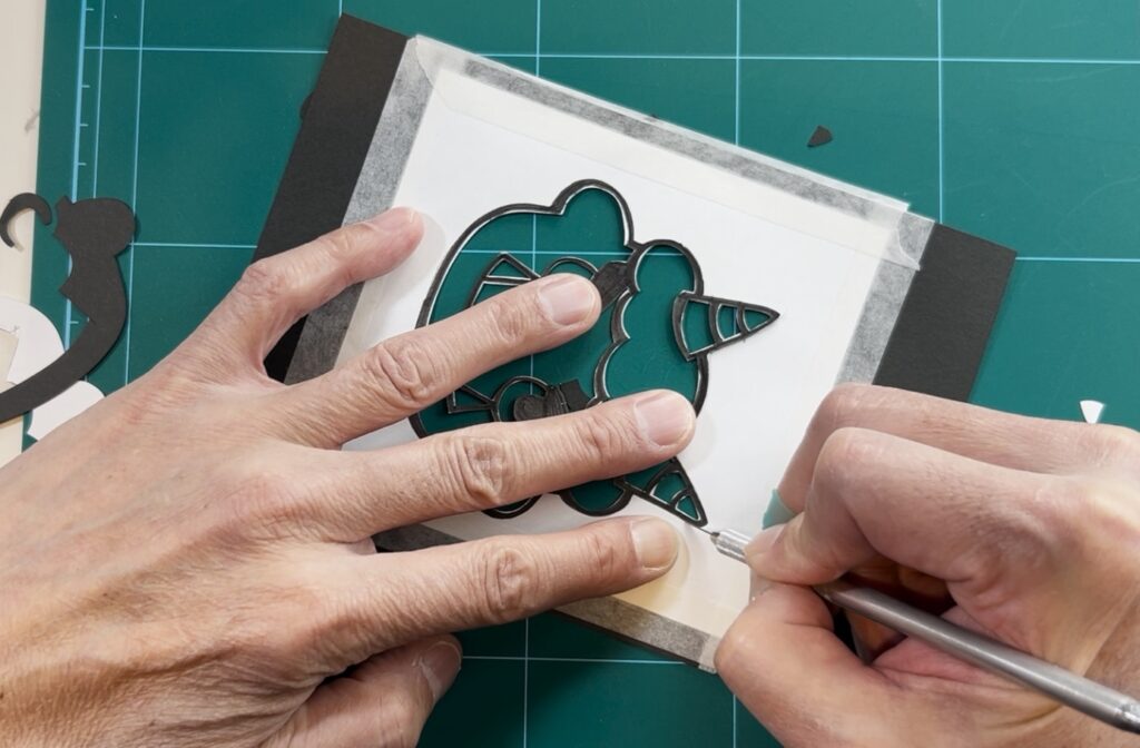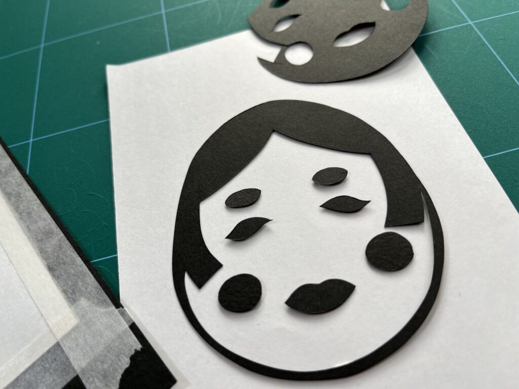 もし「輪郭」から先に切ってしまうと、紙がペラペラと不安定になり、最後に細かい目などを切る時に紙が引っ張られて千切れやすくなります。