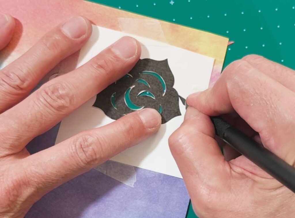 準備ができたら、図案の線に沿って上からデザインナイフでカットしていきます。