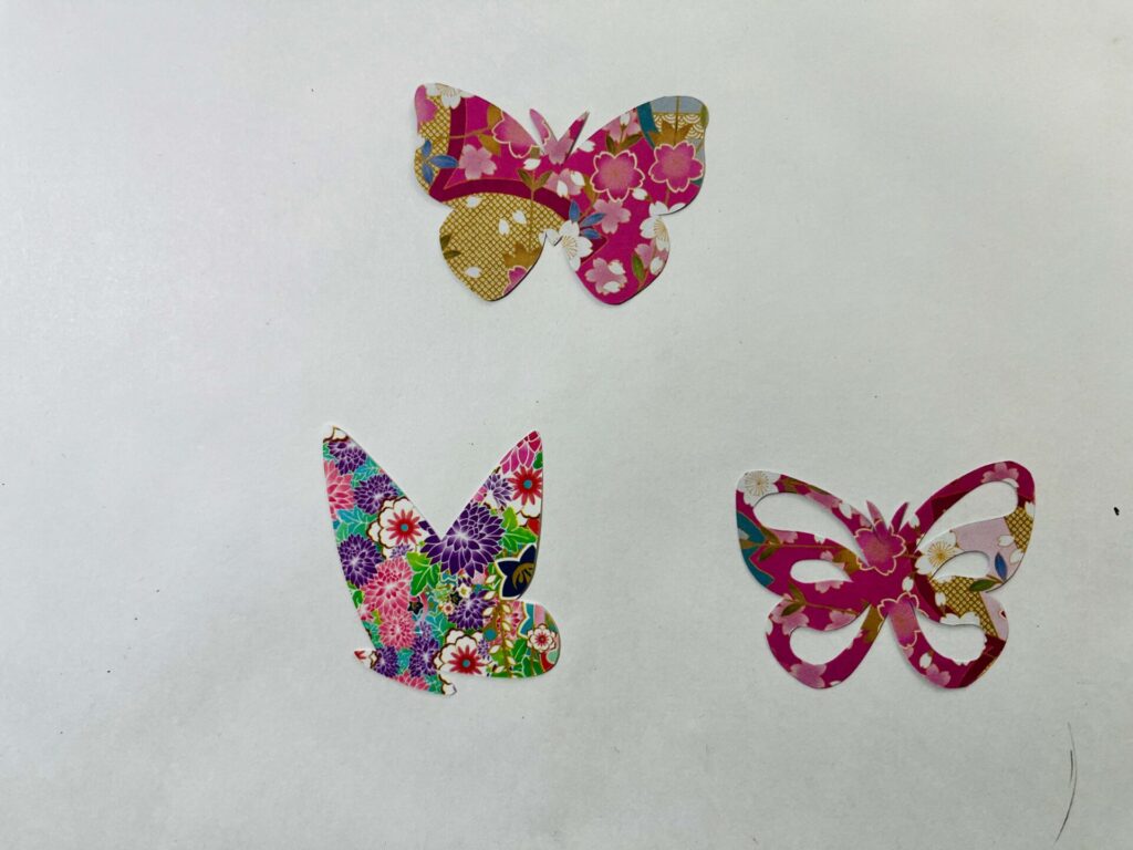 蝶は輪郭のシルエットを千代紙でカットすると、とても華やかで素敵な仕上がりになりますよ。