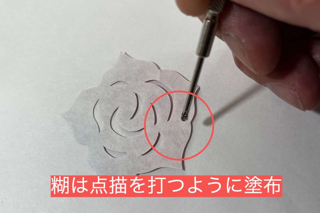 「爪楊枝」や「精密ドライバー」の先にのりをつけ、「点描を打つように」少量ずつちょんちょんと乗せていくのが、波打ちを防いで綺麗に貼るための最大の秘訣です。