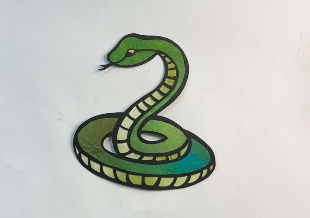 内側の模様がすべて切り終わったら、最後に蛇特有の曲線を活かして外側の輪郭線を切り抜きます。