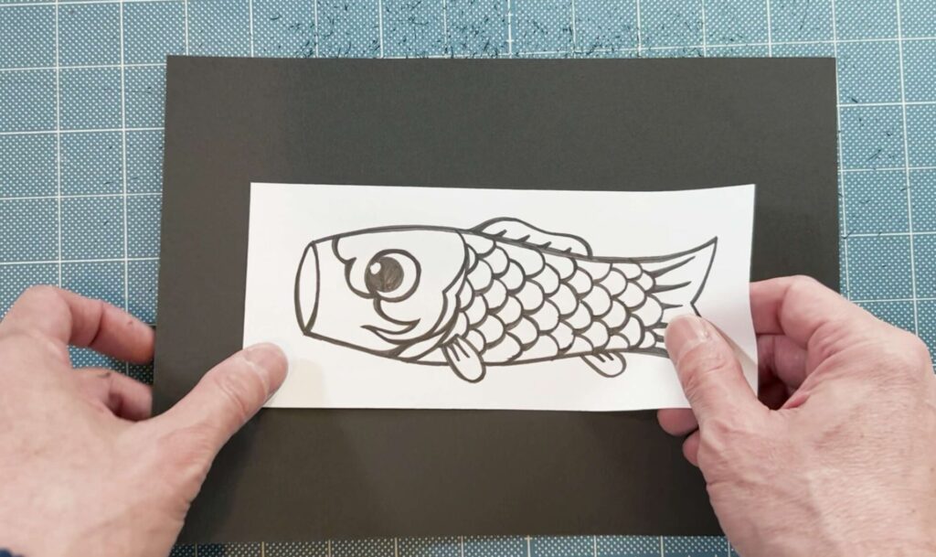 まず、黒い画用紙の上に、印刷した図案を重ねます。