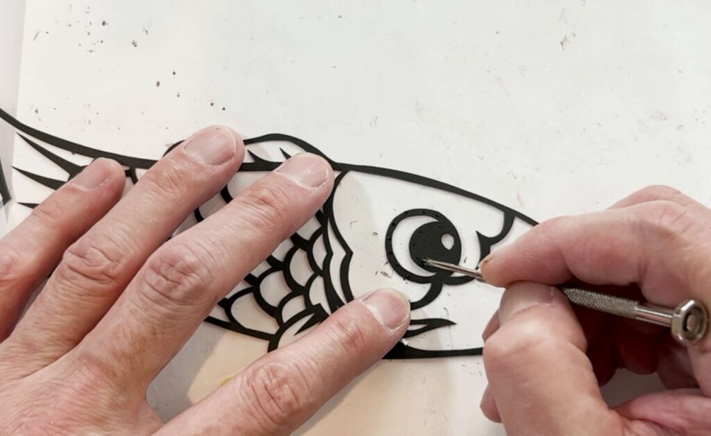 兜の装飾や、こいのぼりの目・鱗など、内側の細かいパーツから切る。