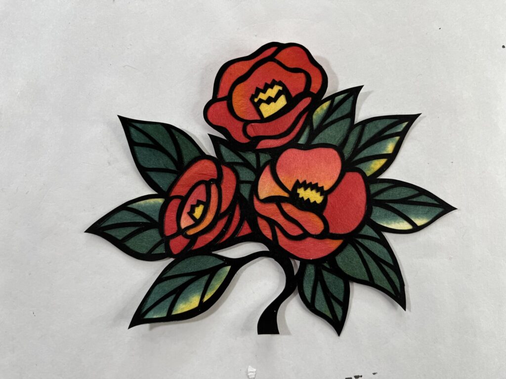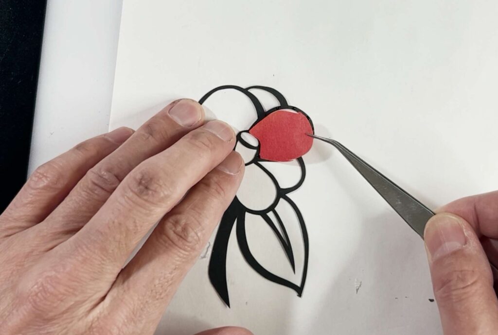 - 色が映える:赤い花、黄色い花蕊(かし)、濃い緑の葉。このコントラストは、黒い紙で切ることでより一層引き立ちます。