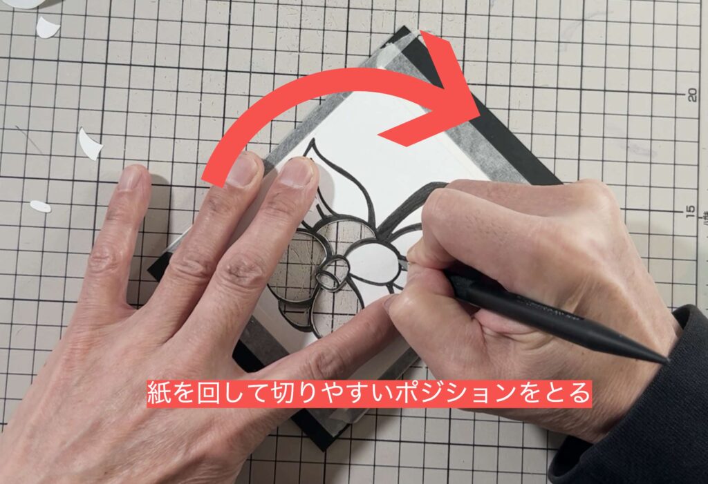 切りづらい時は自分が切りやすいポジションに紙を回していくことがコツです。